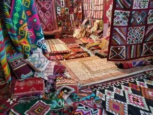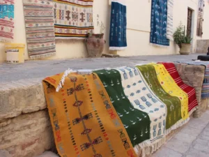 Impossible de parler de Kairouan sans évoquer sa fierté artisanale : le tapis kairouanais, chef-d’œuvre du tissage tunisien. Inspirées des traditions berbères, les tisseuses travaillent sur des métiers en bois, nouant chaque fil avec patience et maîtrise.